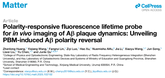 Huang. Z., Wang, Y., Lin, F., Luo, Z., Xu, H., Alifu, N., Li, J., Weng, X., Song, J., Chen, Y. & Qu, J. (2025).Polarity-Responsive Fluorescence Lifetime Probe for In Vivo Imaging of Aβ Plaque Dynamics: Unveiling PBM-Induced Aβ Polarity Reversal.Matter. DOI: 10.1016/j.matt.2025.102102