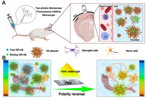 阿尔茨海默病(Alzheimer's Disease, AD)是一种常见的神经退行性疾病,其主要特征是认知功能的进行性下降。尽管AD的确切机制尚未完全阐明,但大量证据表明,淀粉样β蛋白(Aβ)的异常聚集和神经纤维缠结(NFTs)是该疾病的关键病理特征。这些病理变化导致神经元的损伤和死亡,从而引发认知功能的逐渐衰退。光生物调节(Photobiomodulation, PBM)是一种非侵入性治疗方法,通过将可见光或近红外光(400-1100 nm)照射到组织上,产生非热生物效应。近年来,PBM作为一种改善大脑功能的潜在方法引起了广泛关注。研究表明,PBM能够通过多种机制(如诱导伽马振荡、激活保护性免疫反应、上调神经营养因子以及增强脑膜淋巴引流)促进Aβ的清除,从而改善AD模型的认知功能。然而,PBM对Aβ斑块物理化学性质的直接影响仍需进一步研究。本研究通过开发一种新型的极性敏感荧光寿命探针(SiR-Aβ),揭示了PBM可以诱导Aβ斑块极性反转。