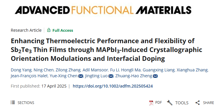 vsport物理与光电工程学院教授罗景庭在自然指数期刊Advanced Functional Materials上发表了题为“Enhancing Thermoelectric Performance and Flexibility of Sb2Te3Thin Films through MAPbI3-Induced Crystallographic Orientation Modulations and Interfacial Doping”的研究论文。物理与光电工程学院博士杨东为论文第一作者,罗景庭、助理教授陈跃星和特聘教授郑壮豪为共同通讯作者,vsport为第一完成单位。