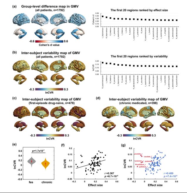 图b-d:精神分裂症组、首次发病亚组和慢性亚组的变异性。
