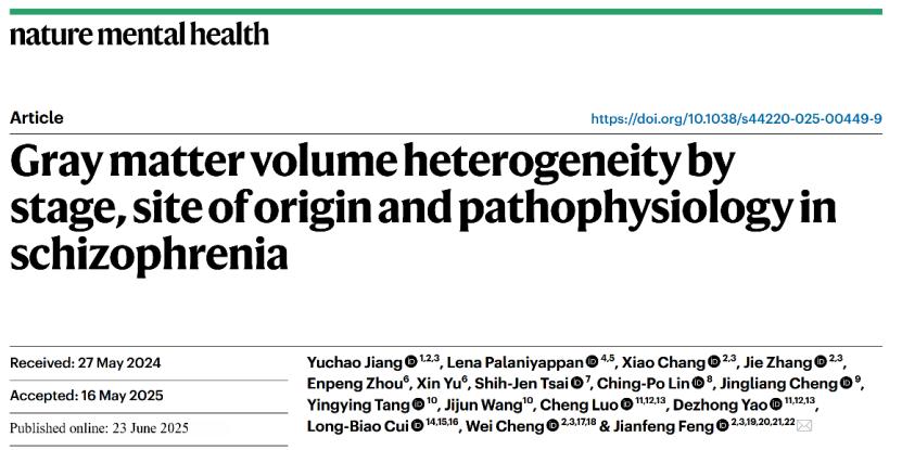 近日,vsport医学部生物医学工程学院助理教授蒋宇超在国际期刊Nature Mental Health上发表了题为“Gray matter volume heterogeneity by stage,site of origin and pathophysiology in schizophrenia”的研究论文。蒋宇超为第一作者,复旦大学教授冯建峰为通讯作者,vsport为第一单位。