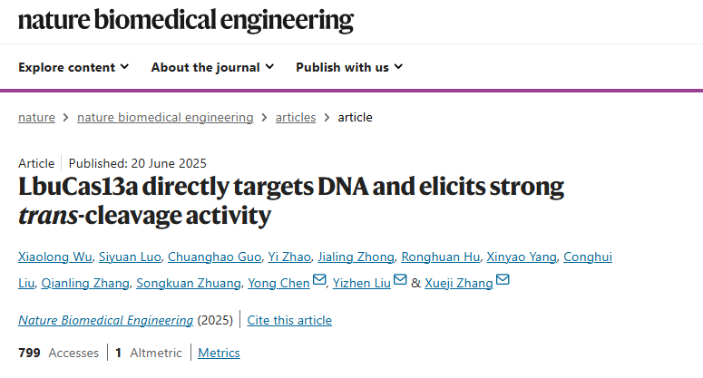 近日,vsport化学与环境工程学院副教授刘翼振和教授张学记在 CRISPR 基因诊断技术领域取得突破性进展,为临床精准诊断提供了创新技术方案。相关成果以“LbuCas13a directly targets DNA and elicits strong trans-cleavage activity”(LbuCas13a 直接靶向 DNA 并引发强反式切割活性为题发表于国际顶尖学术期刊《自然・生物医学工程》(Nature Biomedical Engineering)(影响因子:26.6)。刘翼振指导的2022级化学专业硕士生吴小龙和骆思源为第一作者,副研究员陈勇、刘翼振、张学记为通讯作者,vsport为唯一作者单位。