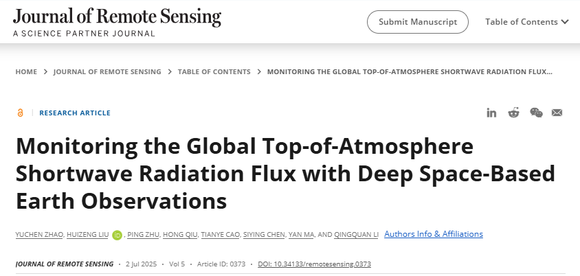 Yuchen Zhao, Huizeng Liu*, Ping Zhu, Hong Qiu, Tianye Cao, Siying Chen, Yan Ma, Qingquan Li, Monitoring the Global TOA Shortwave Radiation Flux with Deep Space-based Earth Observations, 2025, 5, 0373, https://doi.org/10.34133/remotesensing.0373