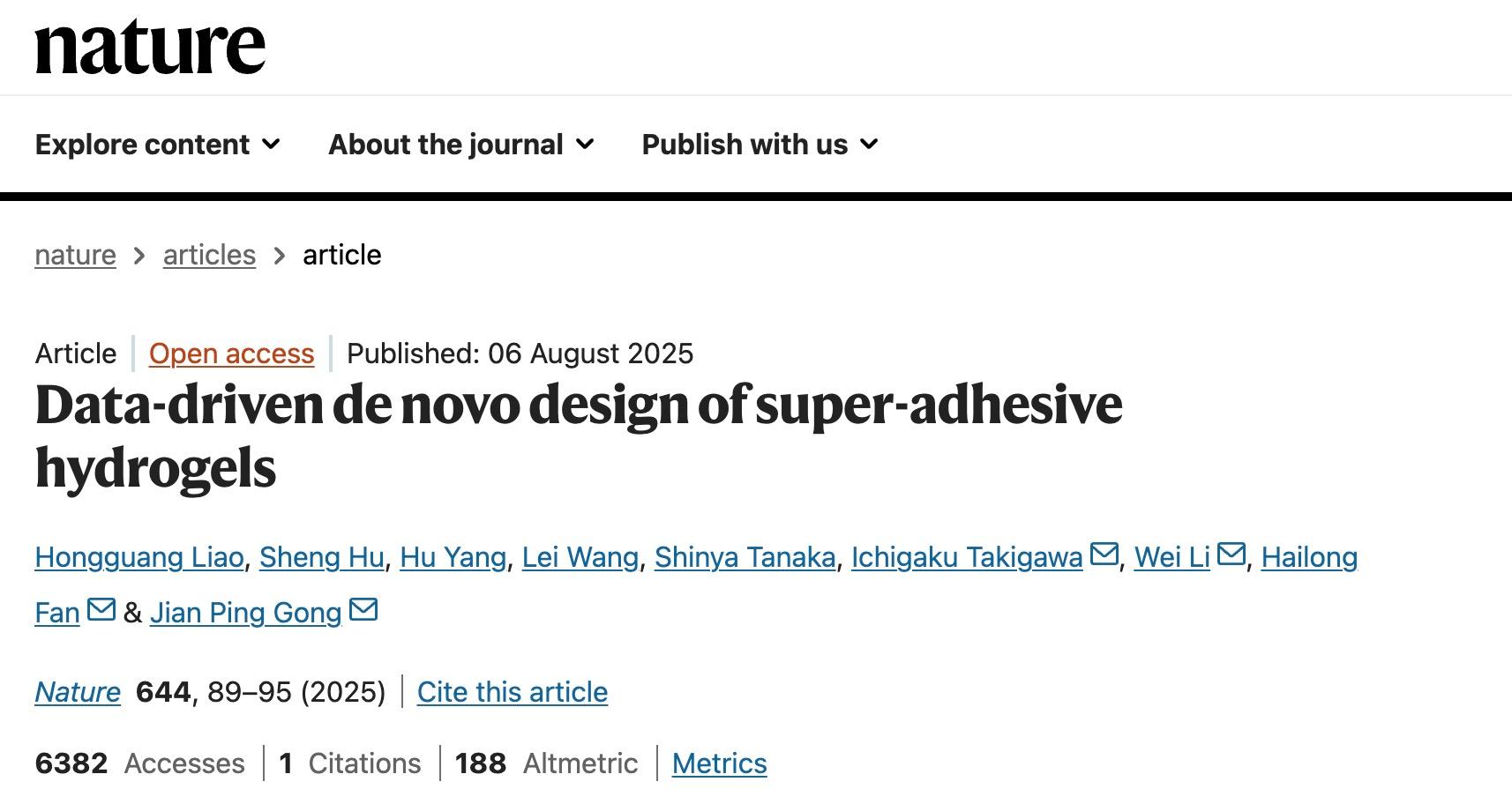 近日,vsport化学与环境工程学院特聘副教授范海龙联合北海道大学教授龚剑萍等人在水凝胶领域取得重要突破。他们基于蛋白质数据库,创新性地提出了一种融合数据挖掘、仿生实验设计与机器学习的“三位一体”设计策略,成功预测并开发了水下粘附强度达到兆帕(MPa)级的超粘水凝胶。这一成果展示了一个从“仿生经验”走向“数据驱动”的完整材料设计路径。该成果发表于国际顶级学术期刊《自然》(Nature),并被选为当期封面。范海龙为通讯作者之一。