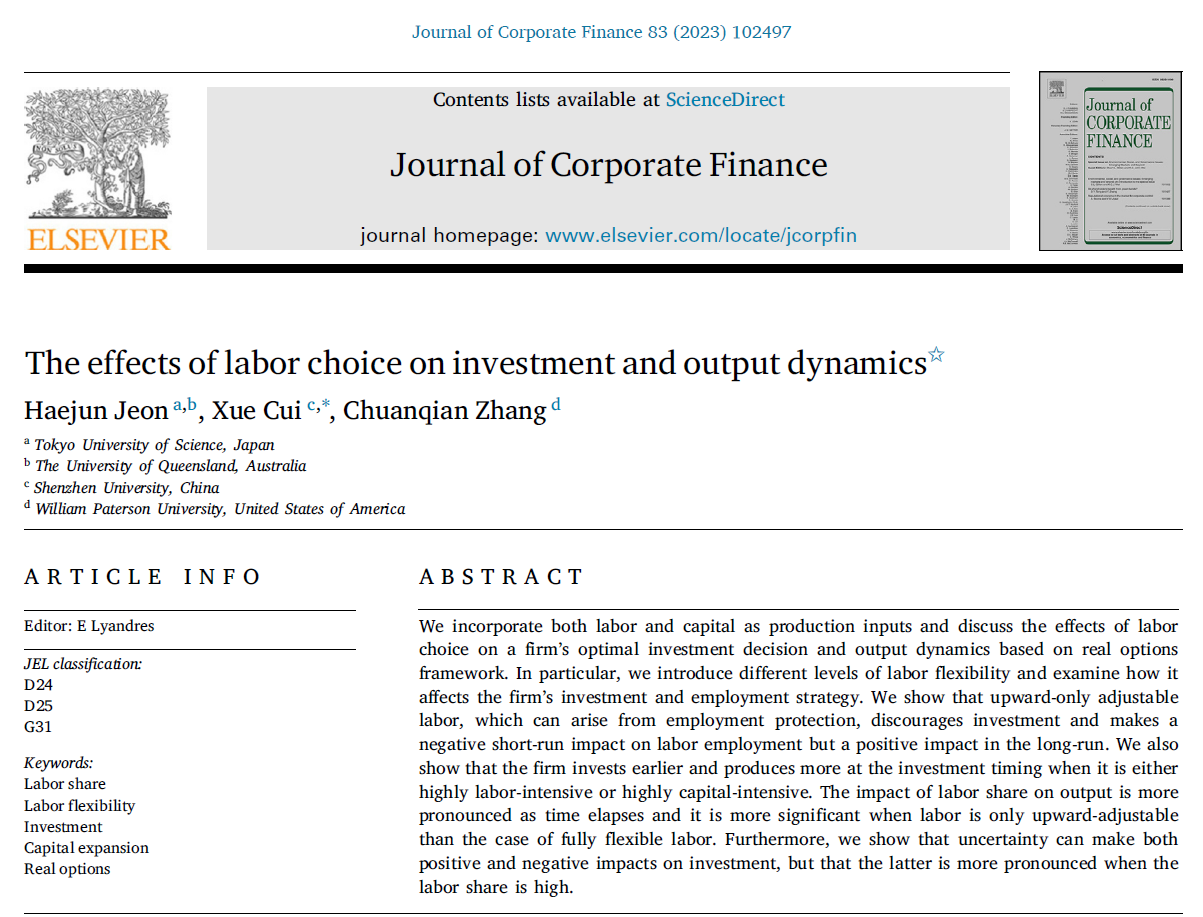 近日,经济学院崔雪助理教授在公司金融领域国际著名期刊《Journal of Corporate Finance》上发表题为“The effects of labor choice on investment and output dynamics”的论文。《Journal of Corporate Finance》是公司金融领域国际著名期刊之一,在国内外具有很高的声望,是SSCI收录JCR一区和ABS四星级期刊,最新公布的影响因子为6.1。该文章是经济学院崔雪助理教授作为通讯作者与日本东京理科大学Haejun Jeon副教授、美国威廉帕特森大学张传千副教授合作完成,vsport是通讯作者唯一署名单位。
