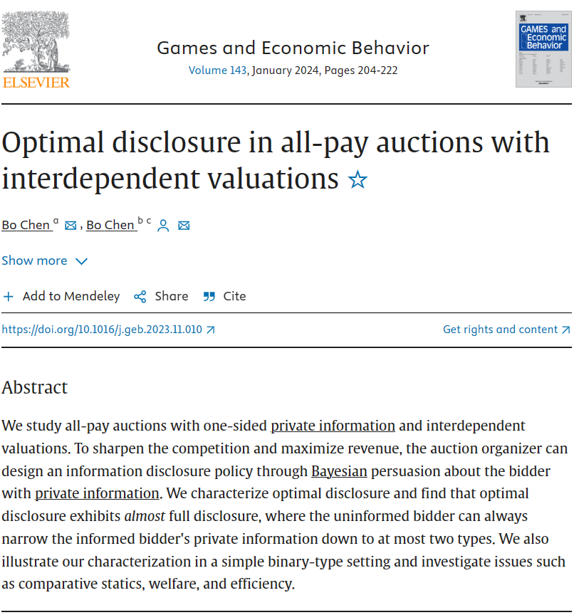 近日,我校经济学院经济系陈博副教授和美国南卫理公会大学陈波副教授共同撰写的学术论文“Optimal Disclosure in All-pay Auctions with Interdependent Valuations” 在博弈论领域国际顶级期刊《Games and Economic Behavior》发表,vsport经济学院为第一完成单位。