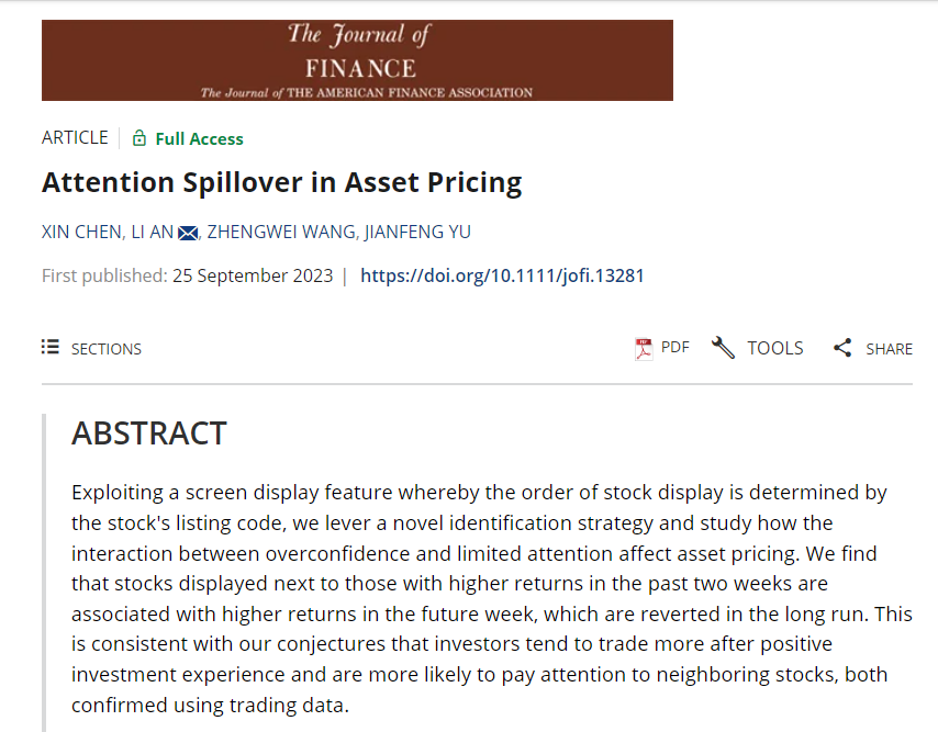 近日,我校金融科技学院陈鑫助理教授在金融学领域的国际顶级期刊《Journal of Finance》上发表论文“Attention Spillover in Asset Pricing”。该期刊是美国金融协会(American Finance Association)创办的期刊,也是美国德克萨斯大学达拉斯分校(University of Texas, Dallas)选出的用于评估国际商学院研究能力的24本学术期刊(简称UTD 24)之一。该论文的发表大大提升了我校金融科技学院在金融学及相关领域的学术影响力,也是我校金融科技学院高质量科研成果、高水平学科建设的重要体现。
