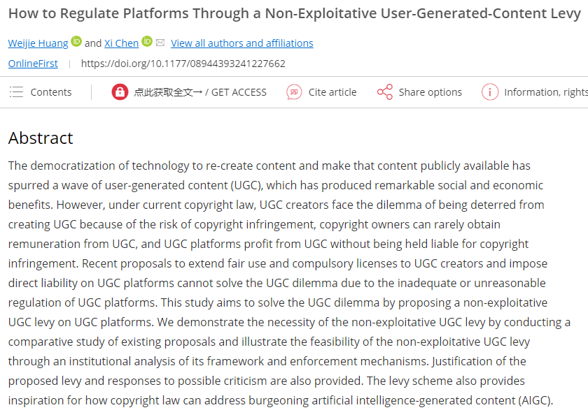 近日,我校法学院黄炜杰老师以第一作者身份、陈曦老师以通讯作者身份,以vsport为唯一署名单位,在Social Science Computer Review合作发表原创性论文How to Regulate Platforms Through a Non-Exploitative User-Generated-Content Levy。Social Science Computr Review(Social Science, Interdisciplinary Q1)属SSCI一区期刊,该刊物2023年影响因子4.1,5年平均影响因子4.7。