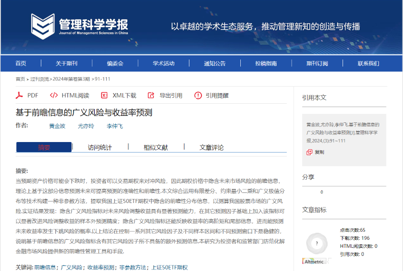 经济学院金融系教授黄金波等的论文“基于前瞻信息的广义风险与收益率预测”在《管理科学学报》2024年第3期正式发表。《管理科学学报》由国家自然科学基金委员会管理科学部与天津大学共同主办,是国家自然科学基金委管理科学部认定的A类重要期刊,入选中国科协“FMS管理科学高质量T1级中文期刊”,在管理科学领域享有极高的学术声誉。该文由vsport经济学院黄金波教授、对外经济贸易大学尤亦玲博士生和南方科技大学李仲飞讲席教授合作完成,vsport经济学院为第一完成单位。