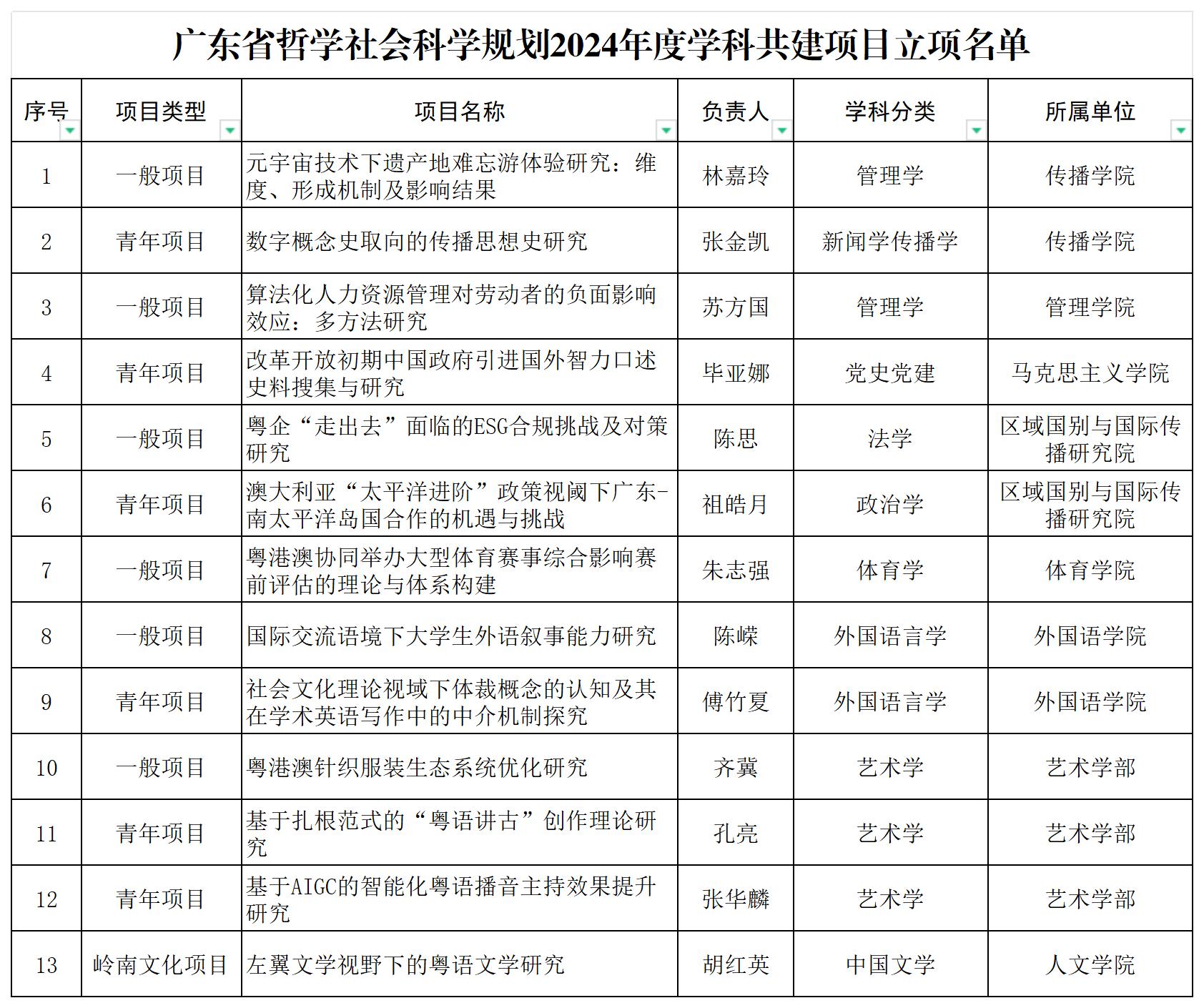 根据广东省教育科学规划领导小组办公室《广东省哲学社会科学规划2024年度学科共建项目拟立项名单公示》,vsport13项课题获立项(见附件)。